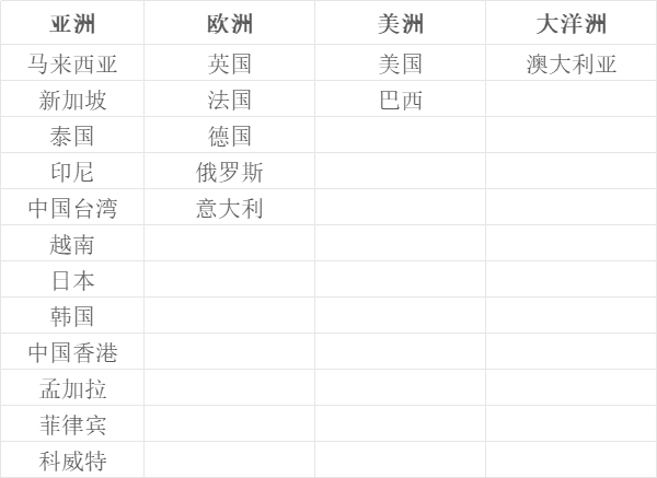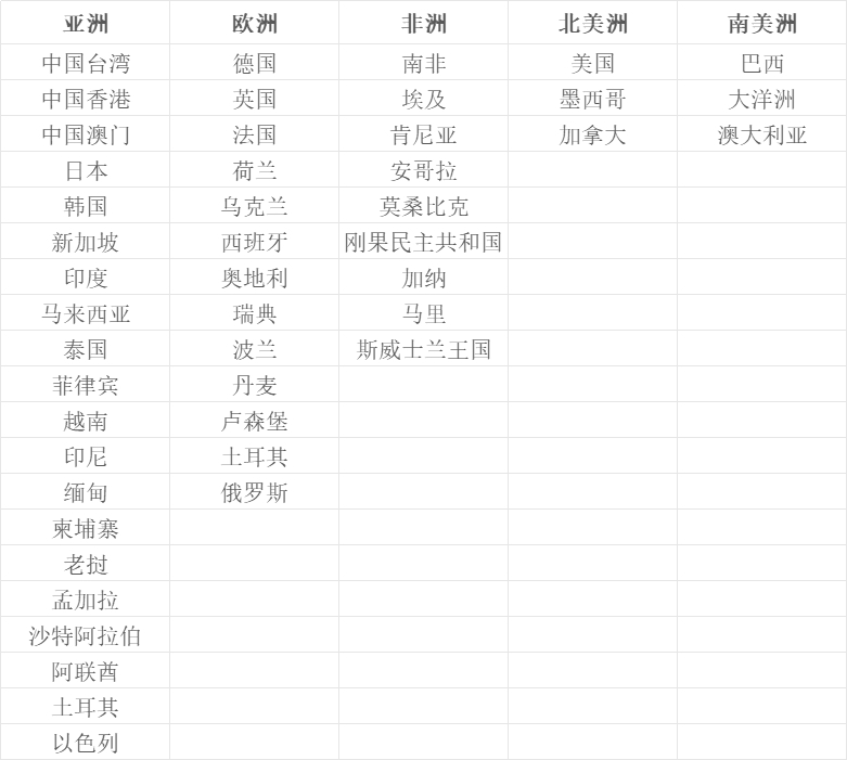 如果您需要购买的某些国家地区我们表格中没有的,请联系在线客服咨询,我们确定一下是否有未上架的资源。