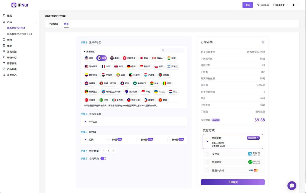 购买端口静态住宅(ISP)时,按照自己的需要选择代理类型、国家、地区、数量等条件。这里以静态住宅ISP为例,点击:产品–静态住宅ISP代理–购买。(同时支持双协议)