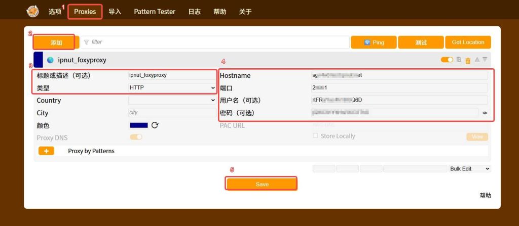 在Proxies中,选择“http”类型,输入代理服务器的地址、端口号、用户名、密码,如下图填写完成后点击最底部Save保存