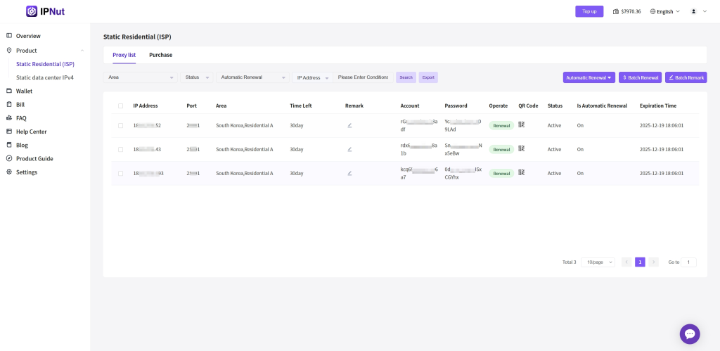- Access: IPNut Platform → Static Residential ISP Proxies → Proxy List