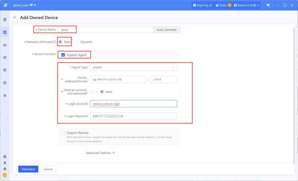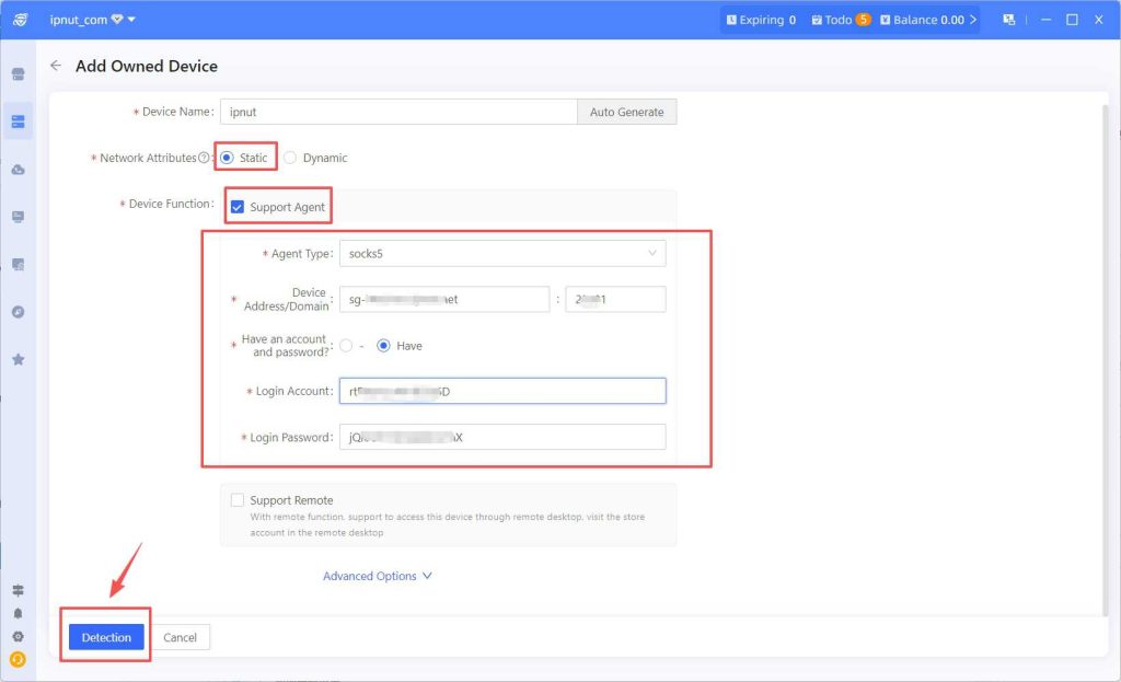 - After completing the information, click the 【Test】 button in the bottom-left corner to perform IP detection